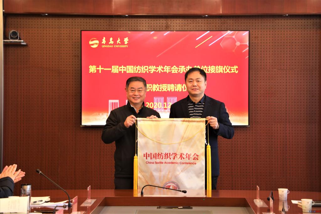新聞網訊 12月3日,第十一屆中國紡織學術年會承辦單位接旗儀式在我校辦公樓第五會議室舉行。中國紡織工程學會理事長伏廣偉、青島大學校長夏東偉出席接旗儀式。儀式由中國紡織工程學會副理事長尹耐冬主持。夏東偉代表學校從伏廣偉手中接過中國紡織學術年會旗幟,紡織學術年會的“青大時間”正式開啟。