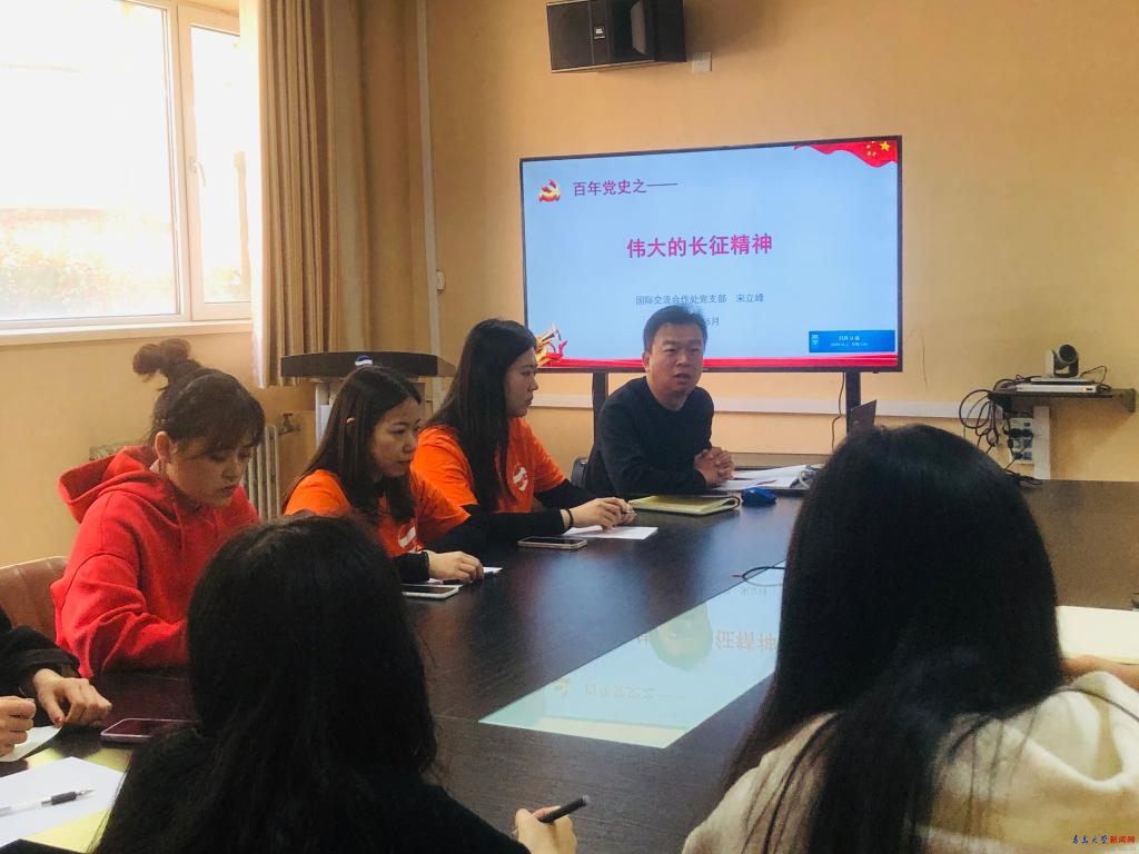 國際交流合作處副處長宋立峰作了關于“百年黨史——偉大的長征精神”的專題黨課,他從“長征”、“毛澤東詩詞里的長征”和“學習感悟”三個方面為大家講述了長征精神,特別是在“毛澤東詩詞里的長征”這一部分,把毛澤東在長征每個階段所寫的詩詞進行了詳細講解,讓大家對長征的歷史以及“長征精神”的實質和內涵有了更為深刻地了解與認識。最后,從廣義長征和狹義長征兩個角度,分享了自己的感悟,鼓勵大家為實現理想目標要不斷艱苦奮斗,把長征精神融入到日常的學習、工作和生活中。