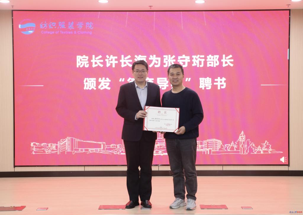 會(huì)上,紡織服裝學(xué)院院長(zhǎng)許長(zhǎng)海為張守珩頒發(fā)“德育導(dǎo)師”聘書(shū)。